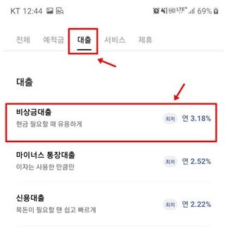 대출 메뉴에서 최상단 비상금대출을 선택합니다.